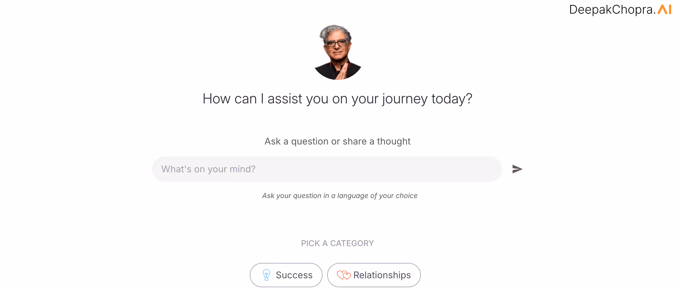 DeepakChopra.ai is a Generative AI companion built around the voice, teachings, and guidance of Dr. Deepak Chopra, the world-renowned pioneer in mind-body wellness. This AI platform offers users personalized conversations, reflections, guided meditations, and wellbeing advice to reduce stress, sleep better, and cultivate mindfulness anytime, anywhere.